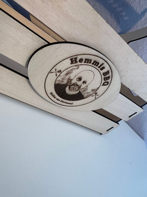 Wie transpoortiert man seine Grillsaucen und Gewürze? Natürlich mit unserem personalisierbarem Träger, welcher aus 3mm Birkensperrholz gefertigt wird. Sofern eine Gravur gewünscht ist, wird diese auf beiden Seiten des Trägers auf dem ovalen Element platziert.