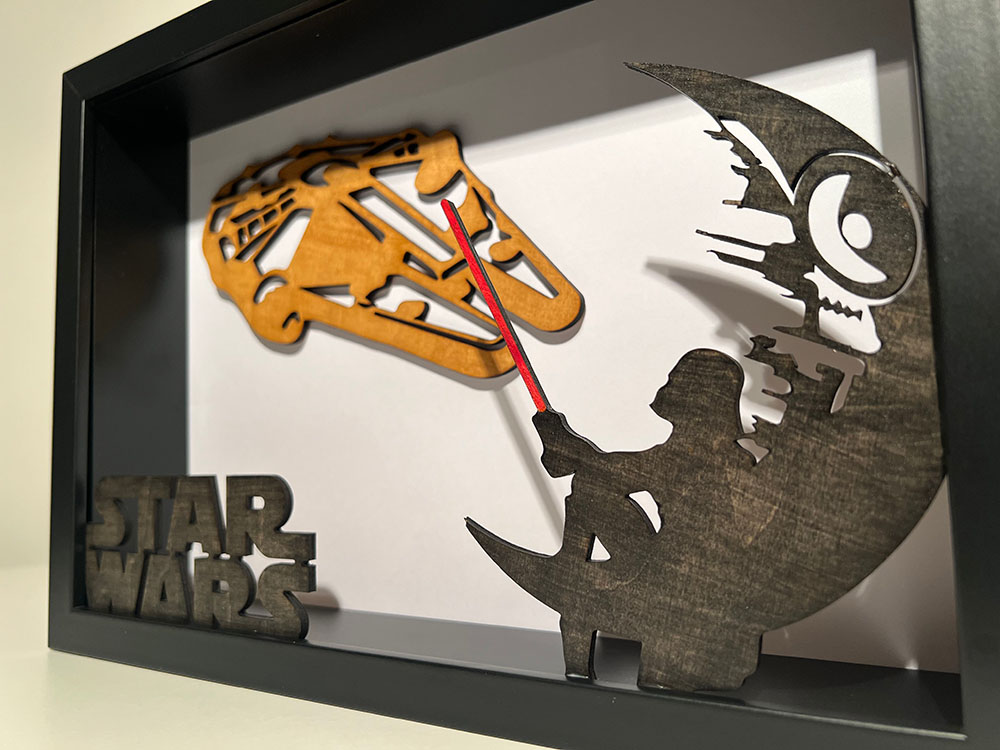 Für jeden StarWars-Fan genau das richtige Geschenk! Mit den bekannten Figuren und Elementen aus dem bekannten Kinofilm wertest du deine Wand auf. Natürlich kannst du dieses tolle und einzigartige Ebenenbild auch aufstellen. Durch die einzigartige Holzmaserung ist jedes Bild ein handgemachtes Unikat.